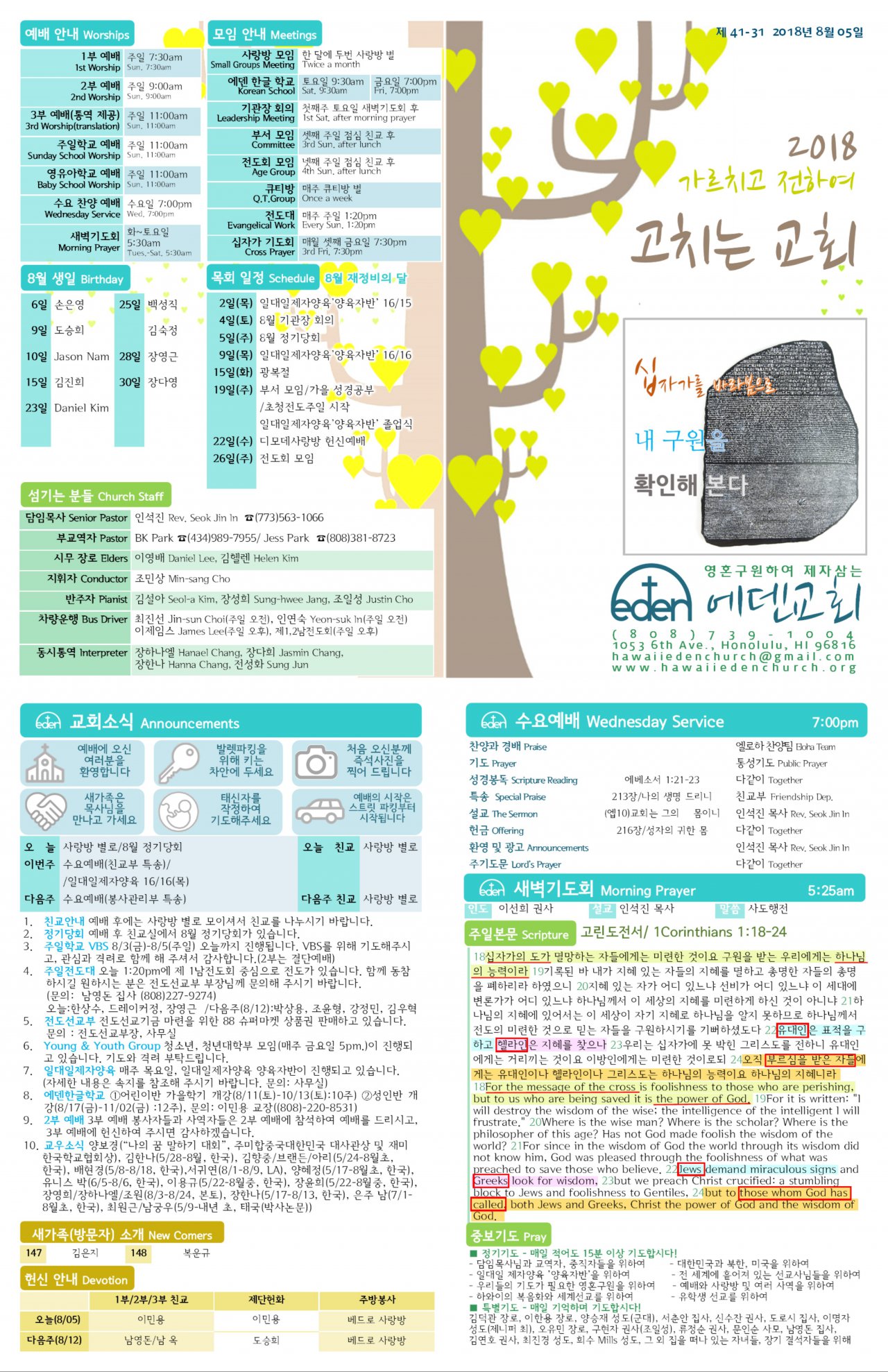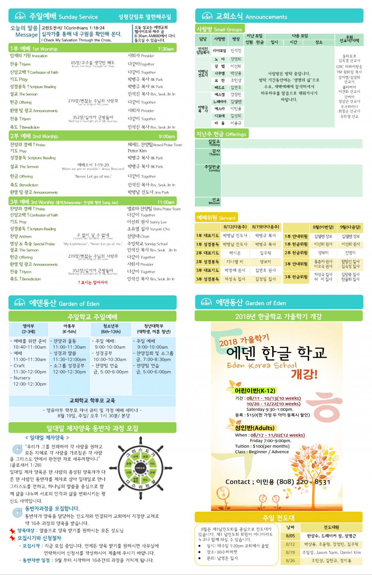 2018/08/05 하와이한인교회 에덴장로교회 주보
