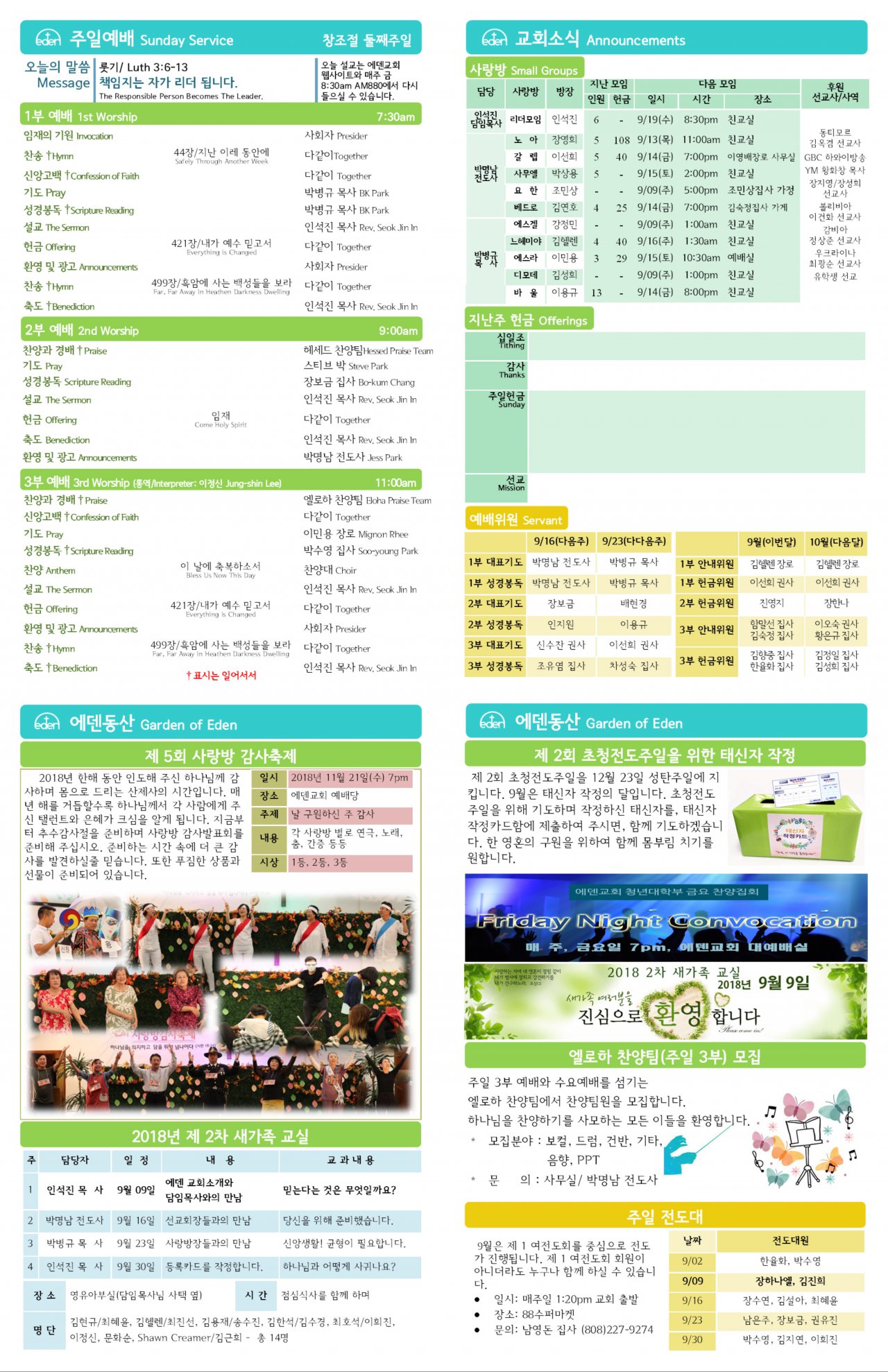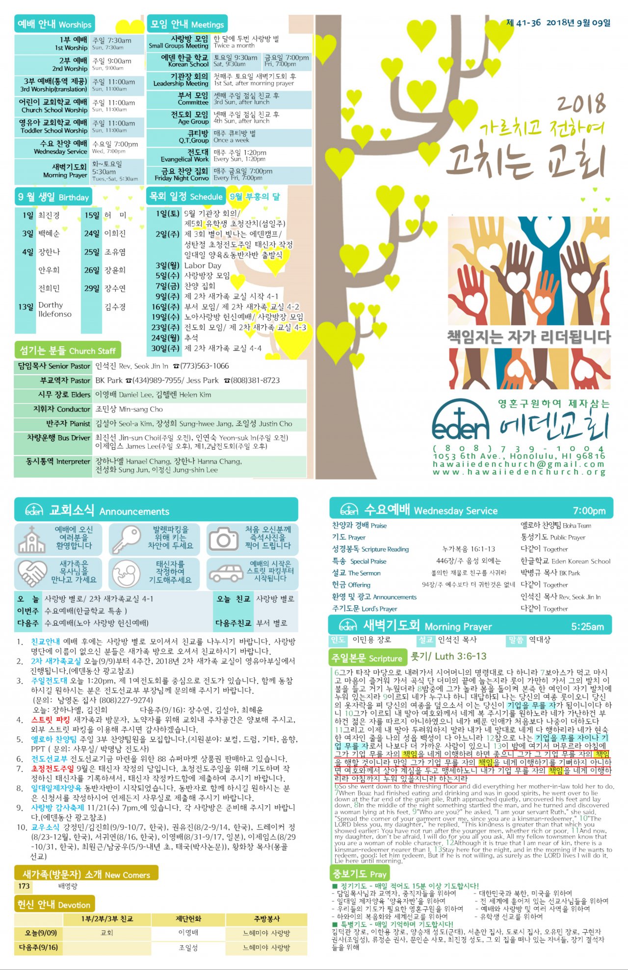 2018/09/09 하와이한인교회 에덴장로교회 주보
