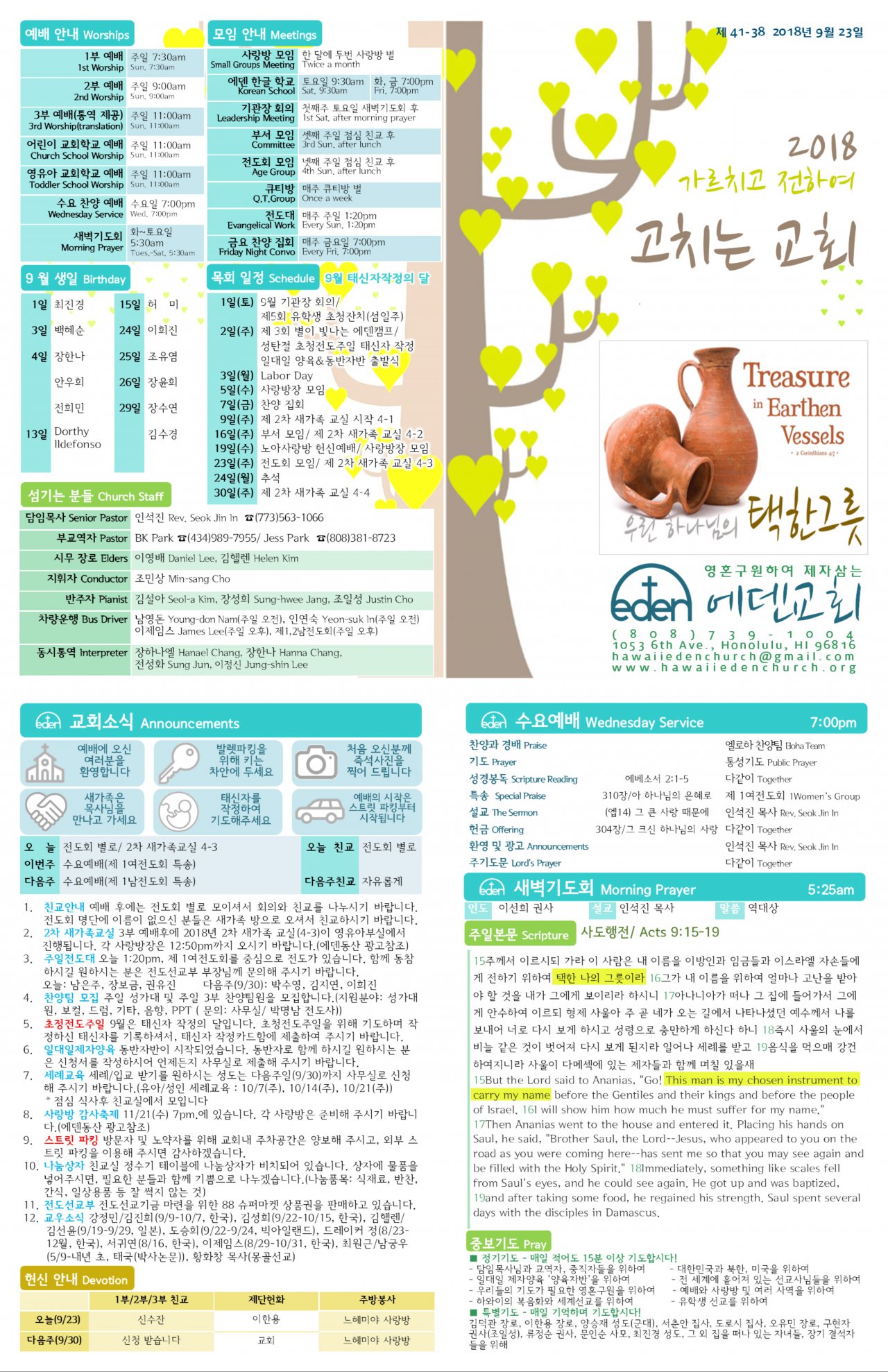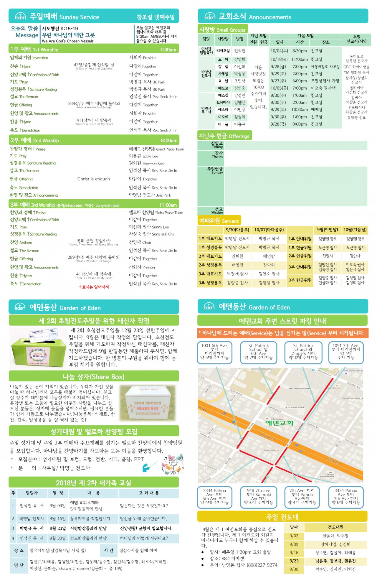 2018/09/23 하와이한인교회 에덴장로교회 주보