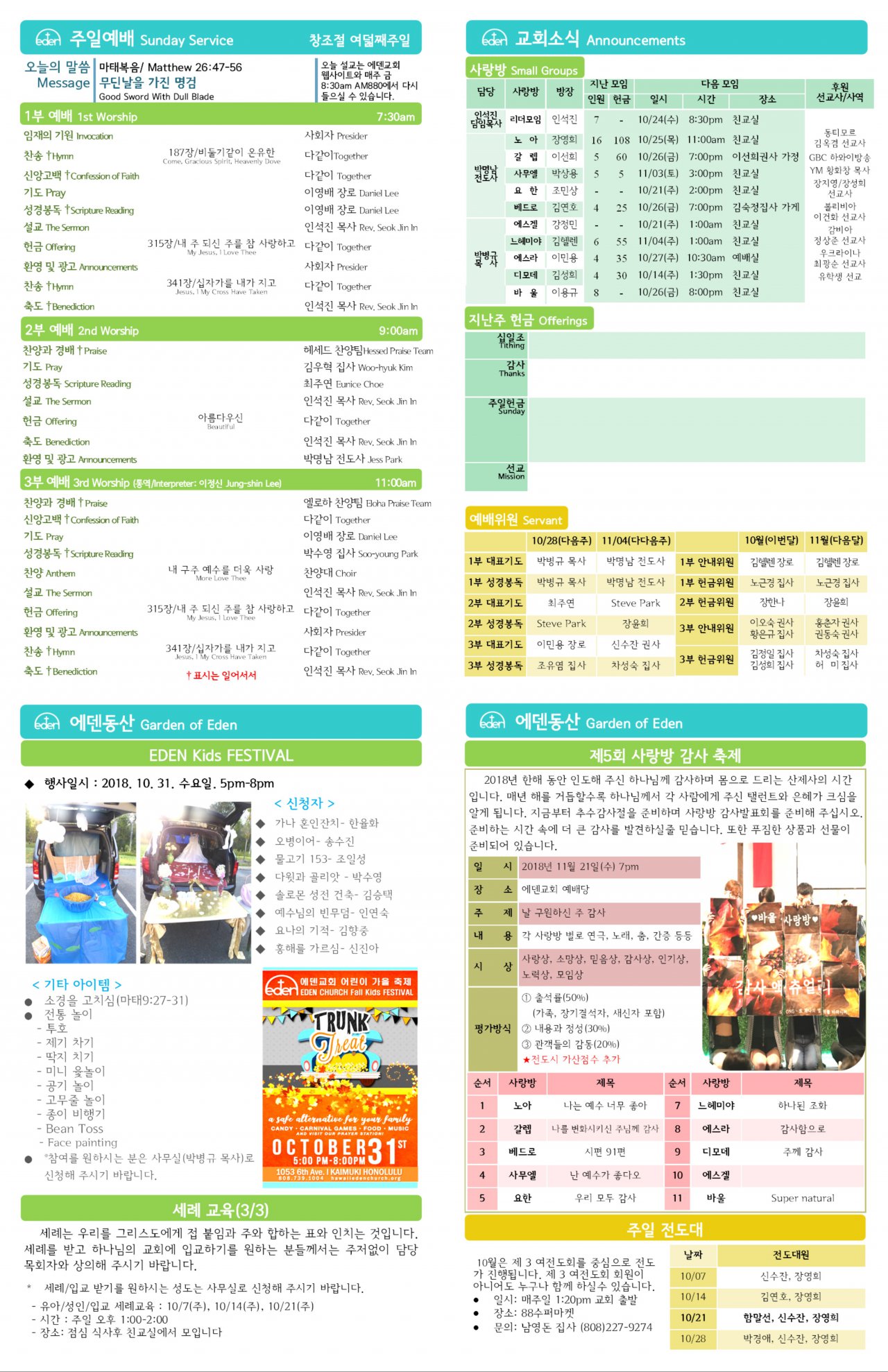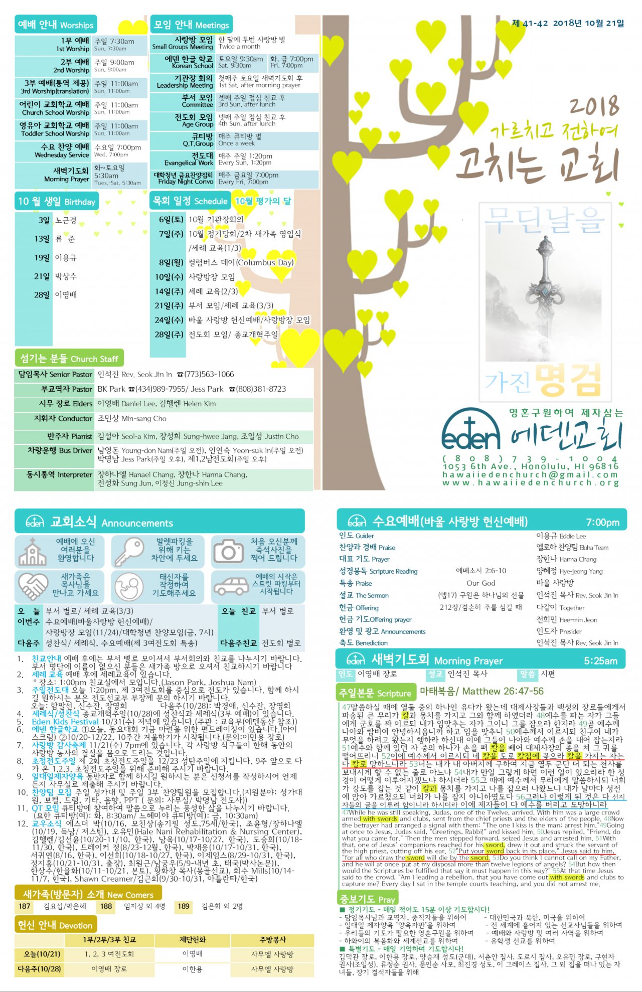 2018/10/21 하와이한인교회 에덴장로교회 주보