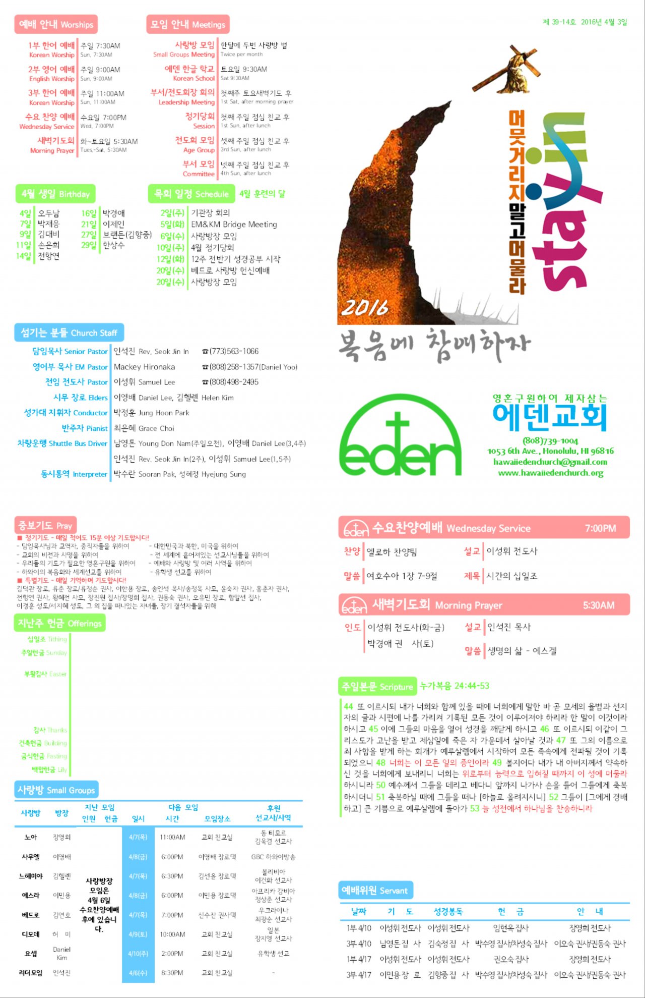 2016/04/03 하와이한인장로교회 에덴교회 주보