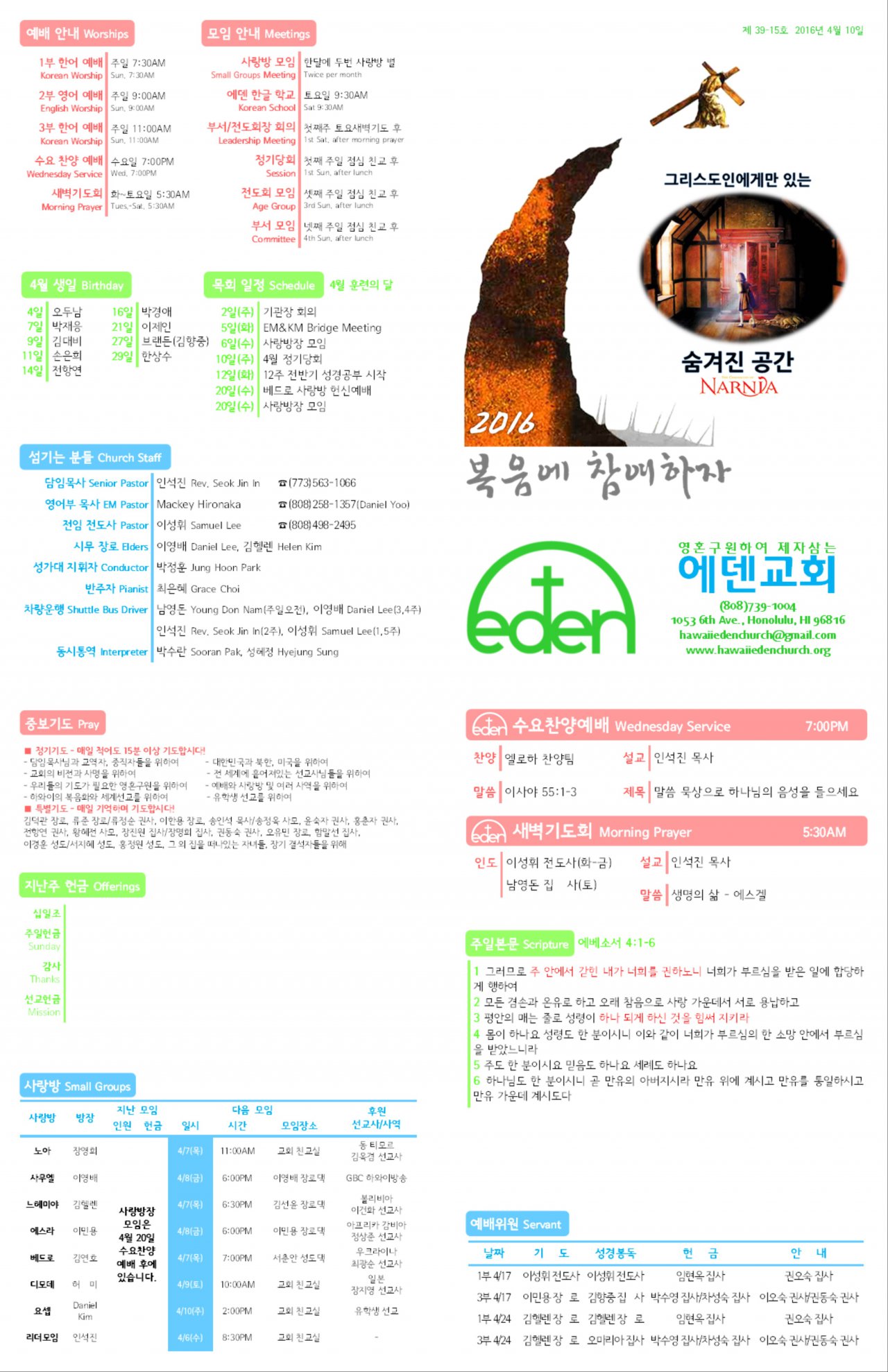 2016/04/10 하와이한인장로교회 에덴교회 주보