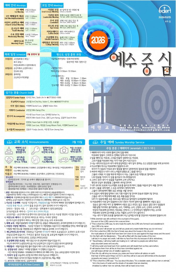 2026/ 3/ 15 하와이한인교회 에덴장로교회 주보