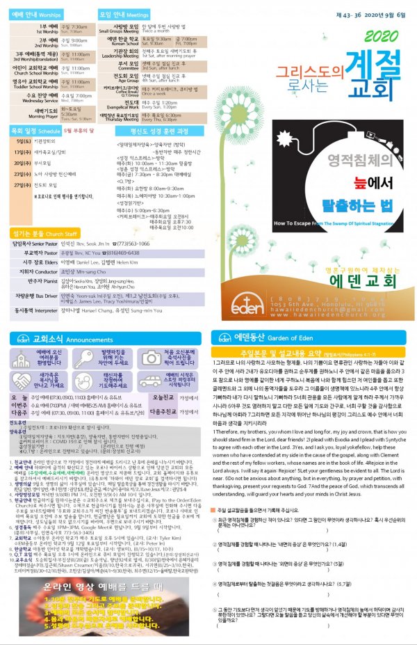 2020/09/20 하와이한인교회 에덴장로교회 주보